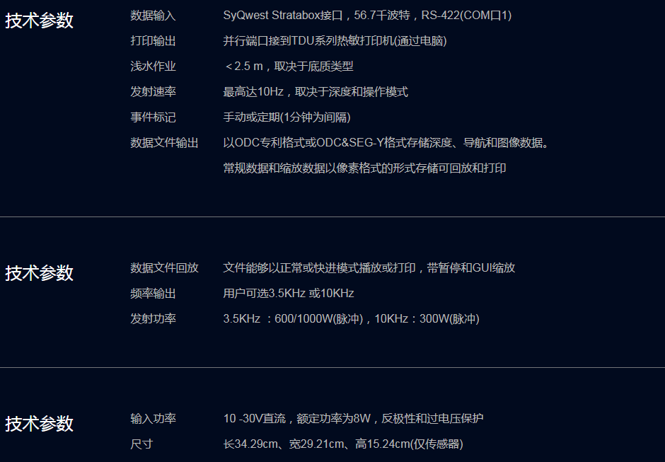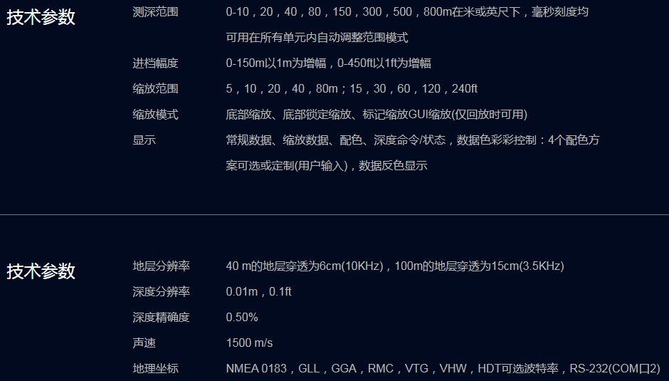 01 水下地层分辨率:40m地层穿透深度时6cm; 02 测深精度:±0.5%; 03 定位数据输入:兼容NMEA; 04 兼容